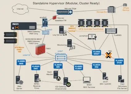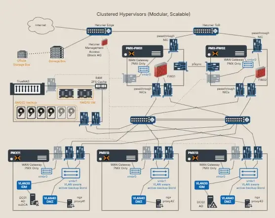Cluster ready, modular stack on Hetzner dedicated hardware. Enterprise grade resilience (two power grids, UPS, generators). 10 VDI users (up to 50 site-to-site). Long-term backups are stored in a Hetzner Storage Box, replicated to an off-site Storage Box in Finland.